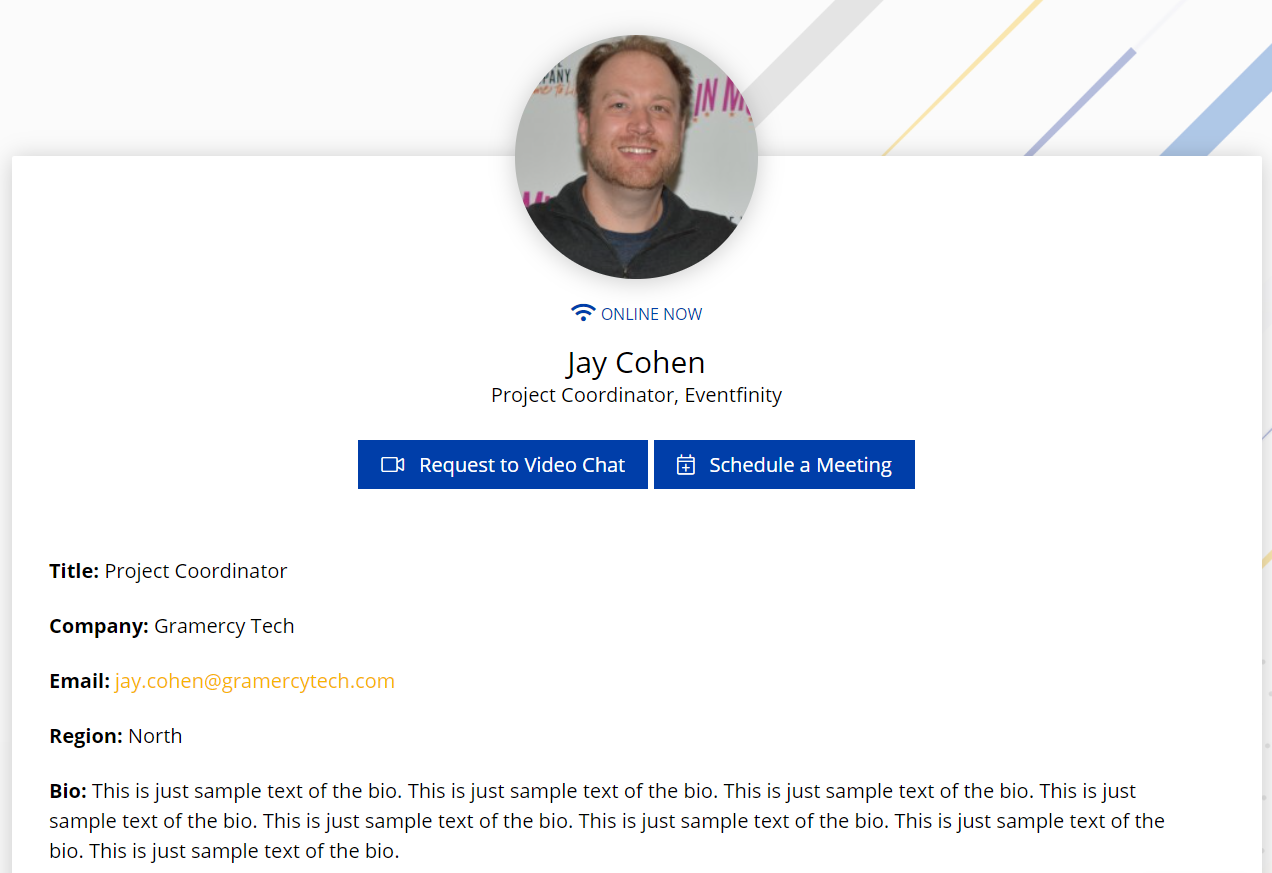 - Click on the user profile for the attendee you would like to network with in order to view their information. Click Request to Video Chat.